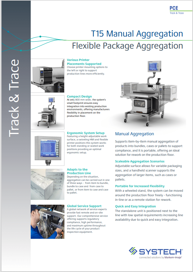 Supports item-by-item manual aggregation of products into bundles, cases or pallets for compliance with Track and Trace labeling. The T15 is portable and therefore an ideal solution for rework on the production floor.